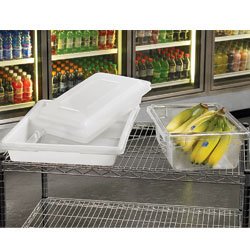 Totes are available in two materials: stain-resistant clear polycarbonate plastic or economical white polyethylene.